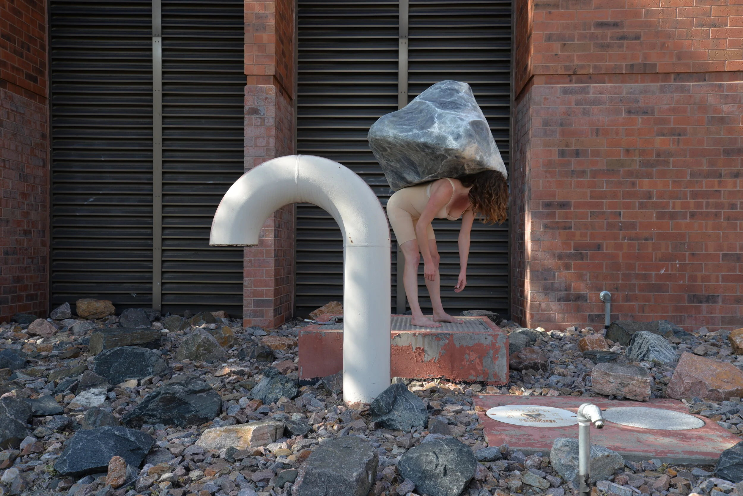 In this ongoing series, I physically wrestle with a paper mâché “boulder” in everyday locations. I wear Spanx, a garment of optical illusion designed to invisibly shape the female form into an object of visual pleasure.